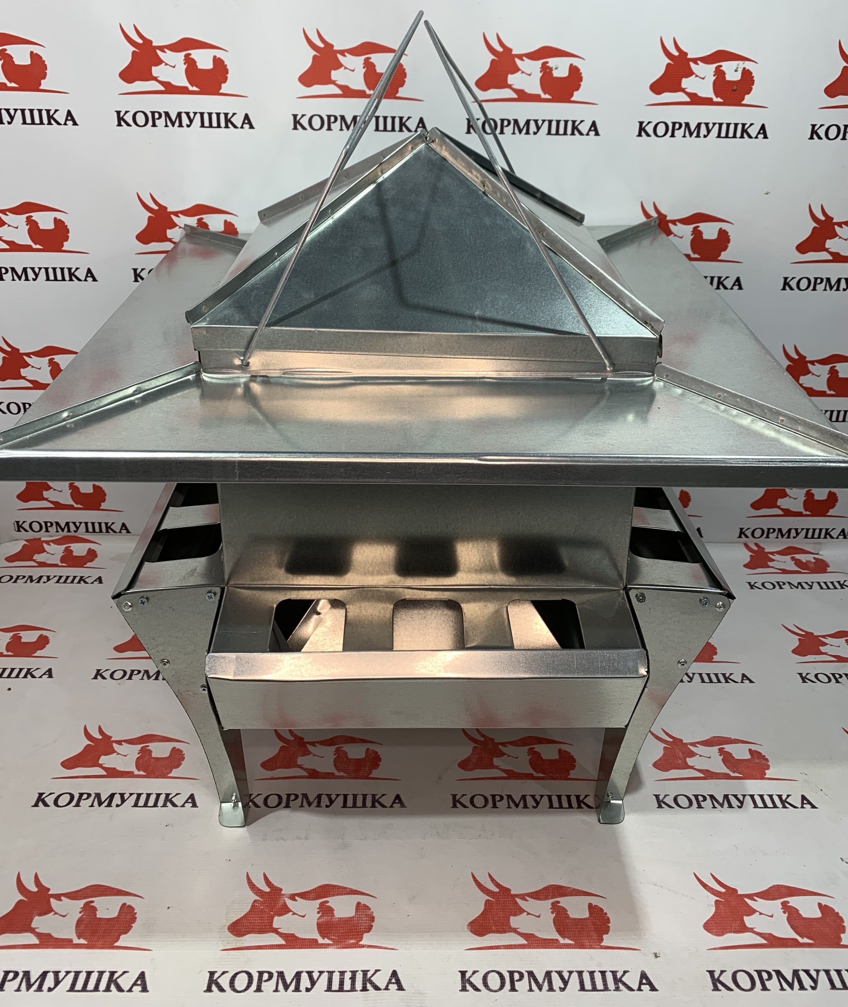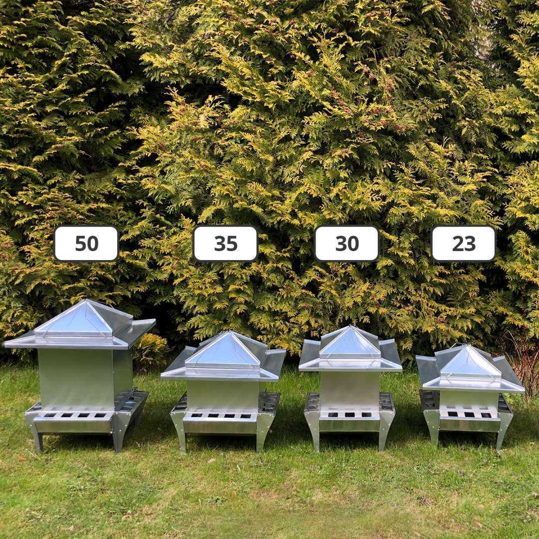 Кормушки оснащены удобными ручками, конусовидной крышкой и защитным козырьком от осадков, который также является крышкой для кормовых окон.