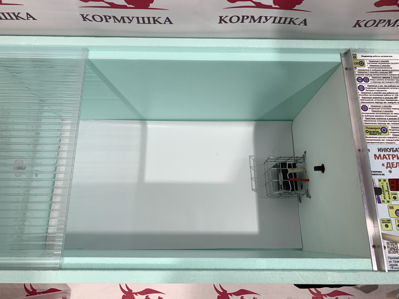 Система автоподлива воды на 3 литра. Новый разъем для подсоединения аккумулятора и шнур для подключения в комплекте. Краткая инструкция прямо на панели управления. Коврик для защиты от мусора и грязи на дне инкубатора. Лоток можно поворачивать и ставить любой стороной к поворотному механизму.