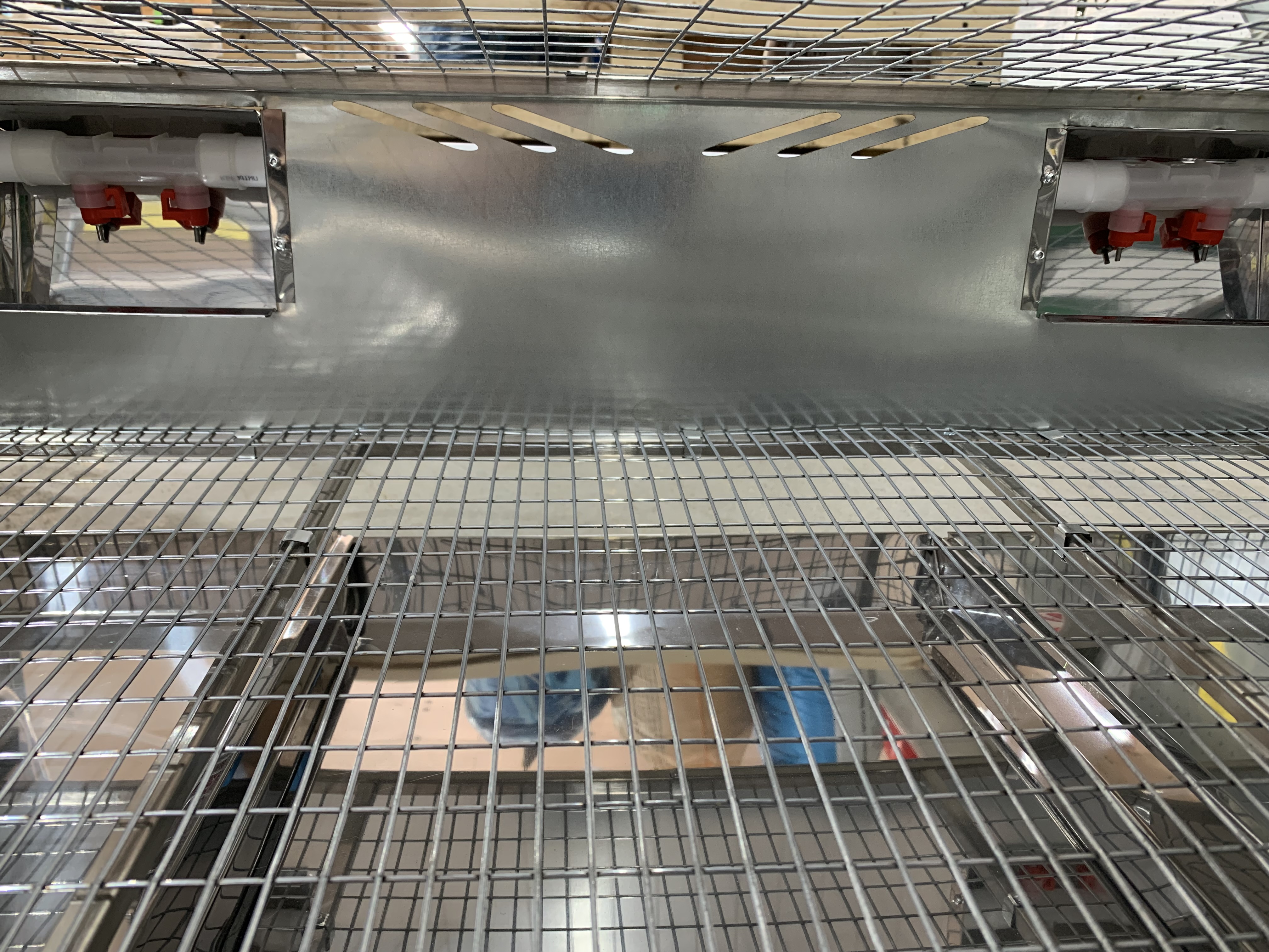 Клетка изготовлена из двухзонного каркаса из нержавейки. Половая сетка с усилителями из нержавеющей трубы, позволяет сохранять ровную поверхность пола. Боковая и задняя стенка из листового металла.