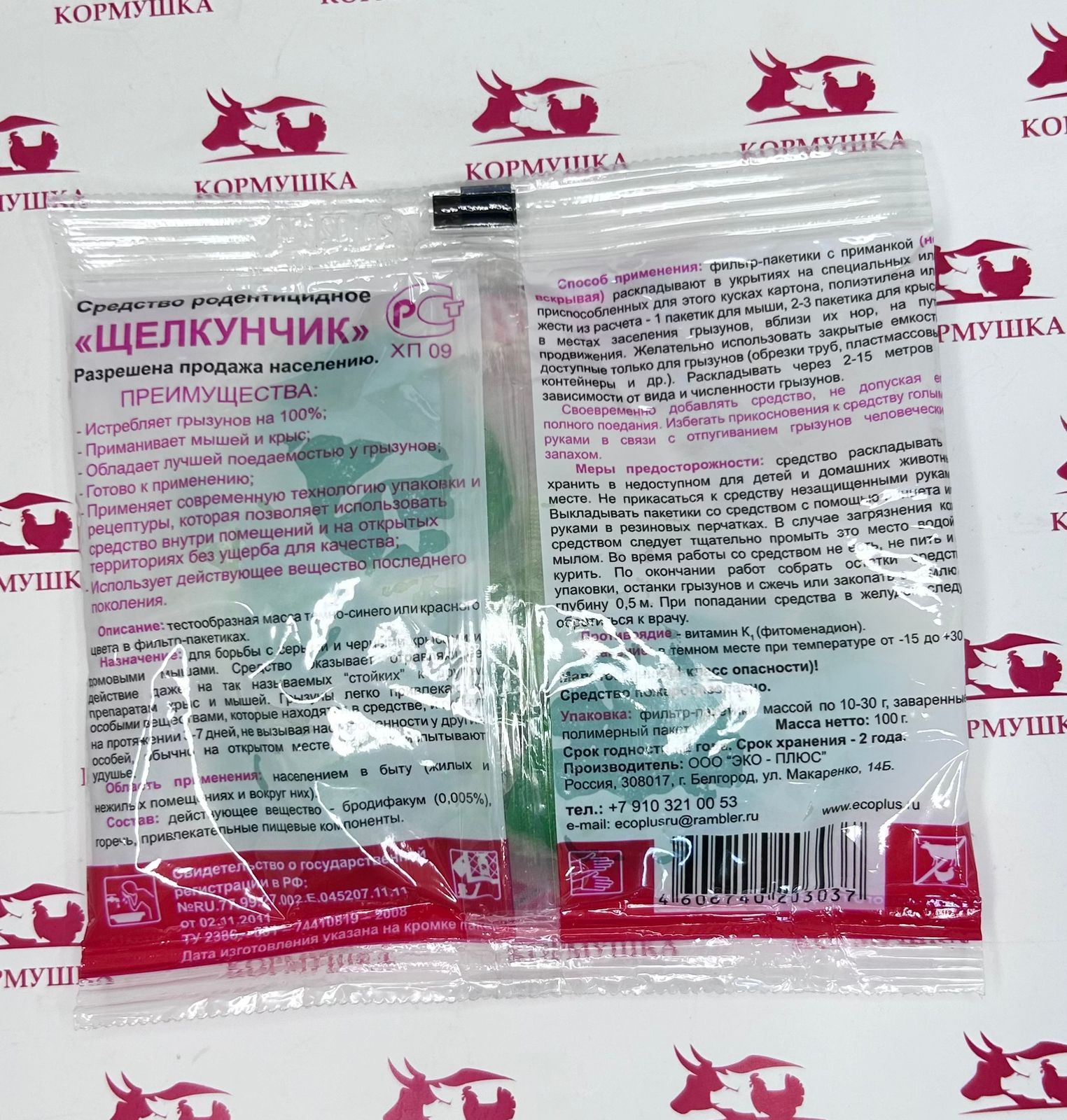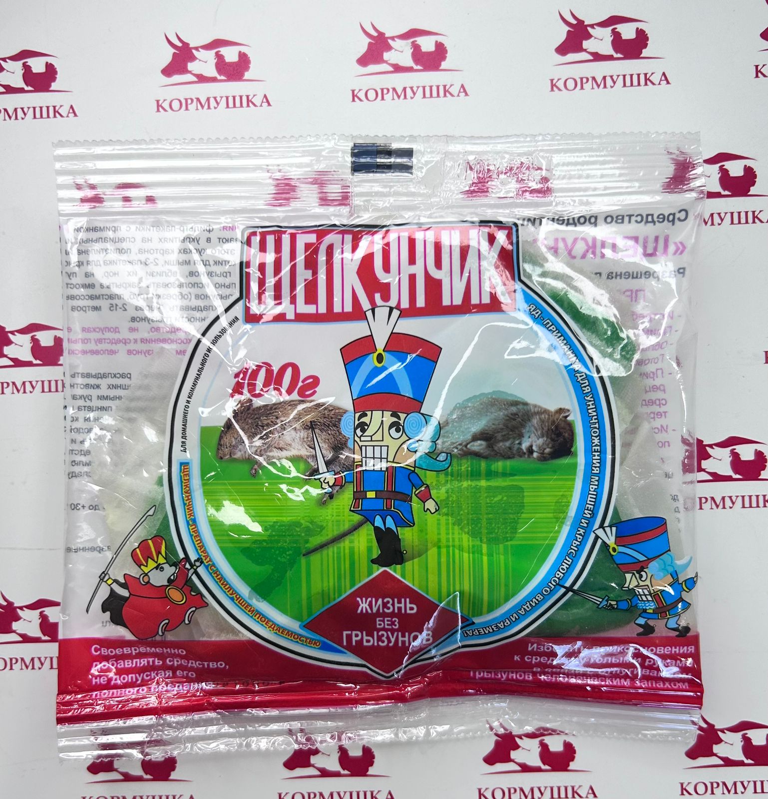 Щелкунчик представляет собой готовую к применению пищевую приманку для борьбы с серыми и черными крысами, а также с домашними мышами на объектах различных категорий. Препарат хорошо работает во влажных условиях: канализациях, водостоках, погребах. СОСТАВ В состав изучаемого средства в качестве действующего вещества входит антикоагулянт второго поколения - бродифакум в концентрации 0,005%. Пищевая основа приманки содержит растительное масло, сахар, ароматизатор пищевой, функциональные добавки - битрекс (горечь), консервант, краситель, мука пшеничная. СВОЙСТВА Приманки на основе бродифакума обладают высокой биологической активностью в отношении серых и черных крыс, домовых мышей.