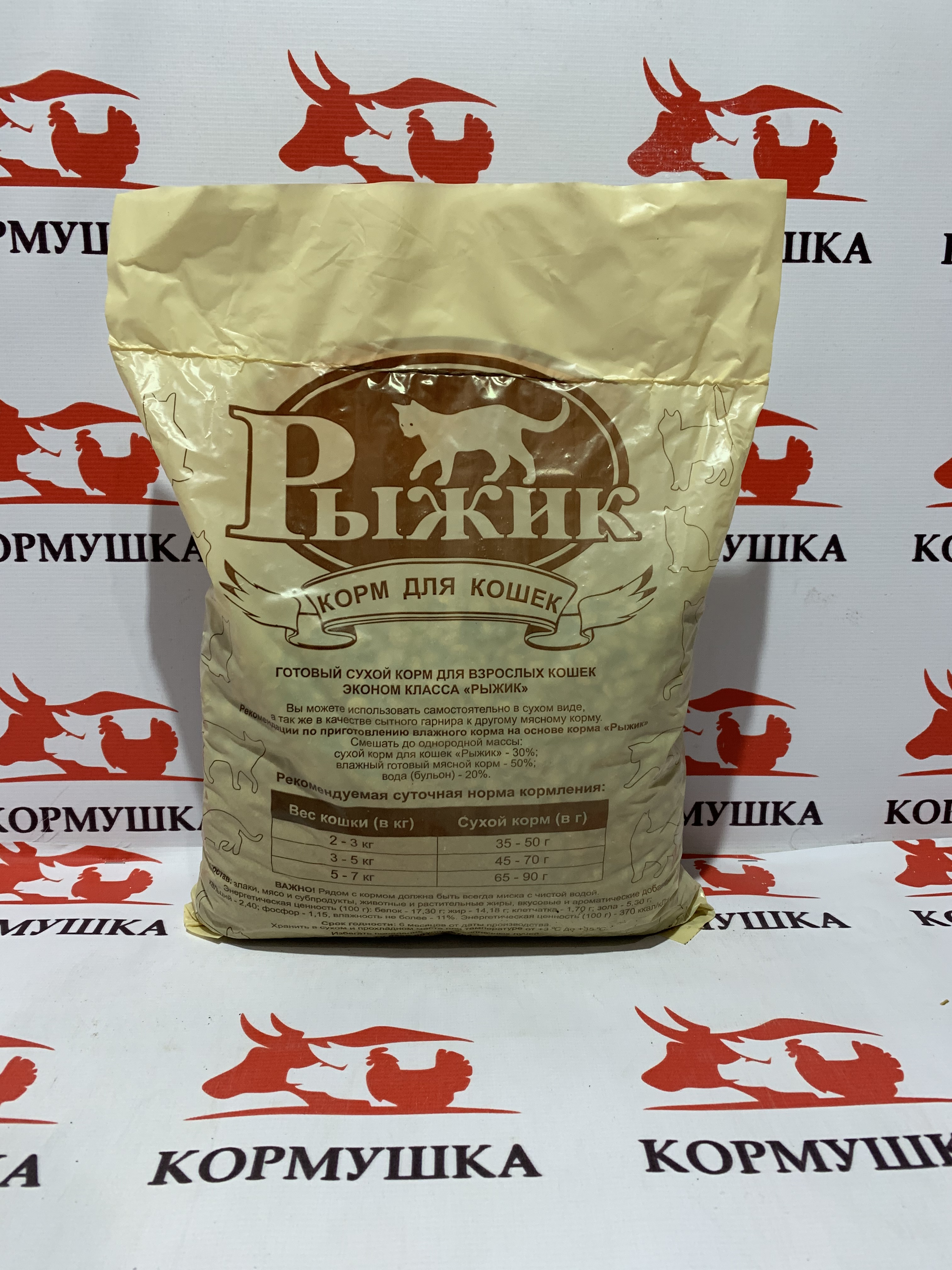 Состав: злаки (пшеница, кукуруза), мясо и субпродукты, растительные и животные жиры, вкусовые и ароматические добавки. Для взрослых кошек. Корм обладает приятным для кошек запахом и вкусом, не требует дополнительной термической обработки, можно вскармливать в сухом или увлажненном виде. При производстве корма «Рыжик» содержащиеся в сырье полезные вещества и витамины сохраняются, а питательная ценность корма увеличивается. Корм «Рыжик» можно использовать в качестве основного рациона или как дополнение (сытный гарнир) к другим мясным кормам.